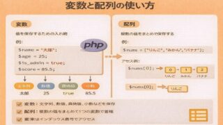 前の記事では、PHPの基本的な書き方と、「サーバーで実行される」という考え方を学びました。ここからは、PHPで処理を組み立てるうえで欠かせない変数とデータ型を扱います。変数とデータ型を理解できると、・条件分岐が書ける・フォームの値を扱える・...